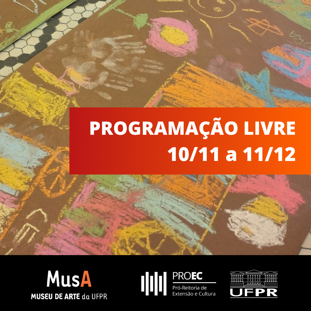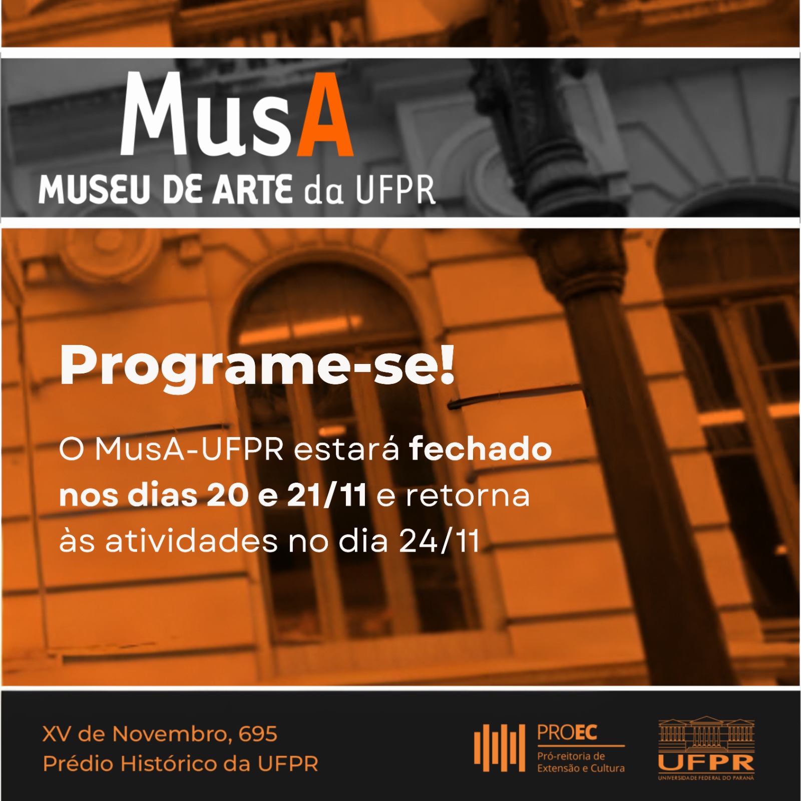 O MusA-UFPR estará fechado nos dias 20 e 21 de novembro. As atividades retornam em 24 de novembro (segunda-feira) com a Programação Aberta, que segue ao longo dos meses de novembro e dezembro. Acompanhe o cronograma completo e venha visitar o MusA!