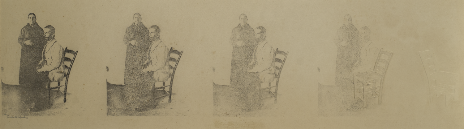Essa gravura de Dal Canton é um jogo de imagens que evidencia a técnica precisa da artista na litografia e no relevo, como um plano sequência de cinco imagens. Vemos um casal e uma cadeira em primeiro plano que, na primeira impressão no papel estão bem delineados pela presença da tinta da matriz e que nos planos seguintes a imagem vai se apagando até somente conseguirmos ver a marca da cadeira, então invertida. Suas vestimentas são características de uma época mais antiga, provavelmente da primeira década do século XX . Esta obra nos leva a pensar sobre presenças e ausências, na ação ou efeito de desaparecer. E também na memória, em como os objetos estão tomados pela presença das pessoas, uma forma de registro de uma recordação de alguém através dos cenários e objetos que ela percorreu e habitou. "Esta série de gravuras e litografias foi concebida a partir da necessidade de um resgate da origem dos imigrantes italianos residentes no sul do Brasil, que surgiu quando eu ministrava aulas na Universidade Estadual de Caxias do Sul (1979-82). [...] Os objetos são a memória da memória. [...] procuro retratar através de imagens o espaço ocupado na memória das pessoas (essa série possui 20 obras)". (DAL CANTON, apud MOREIRA, 2002).