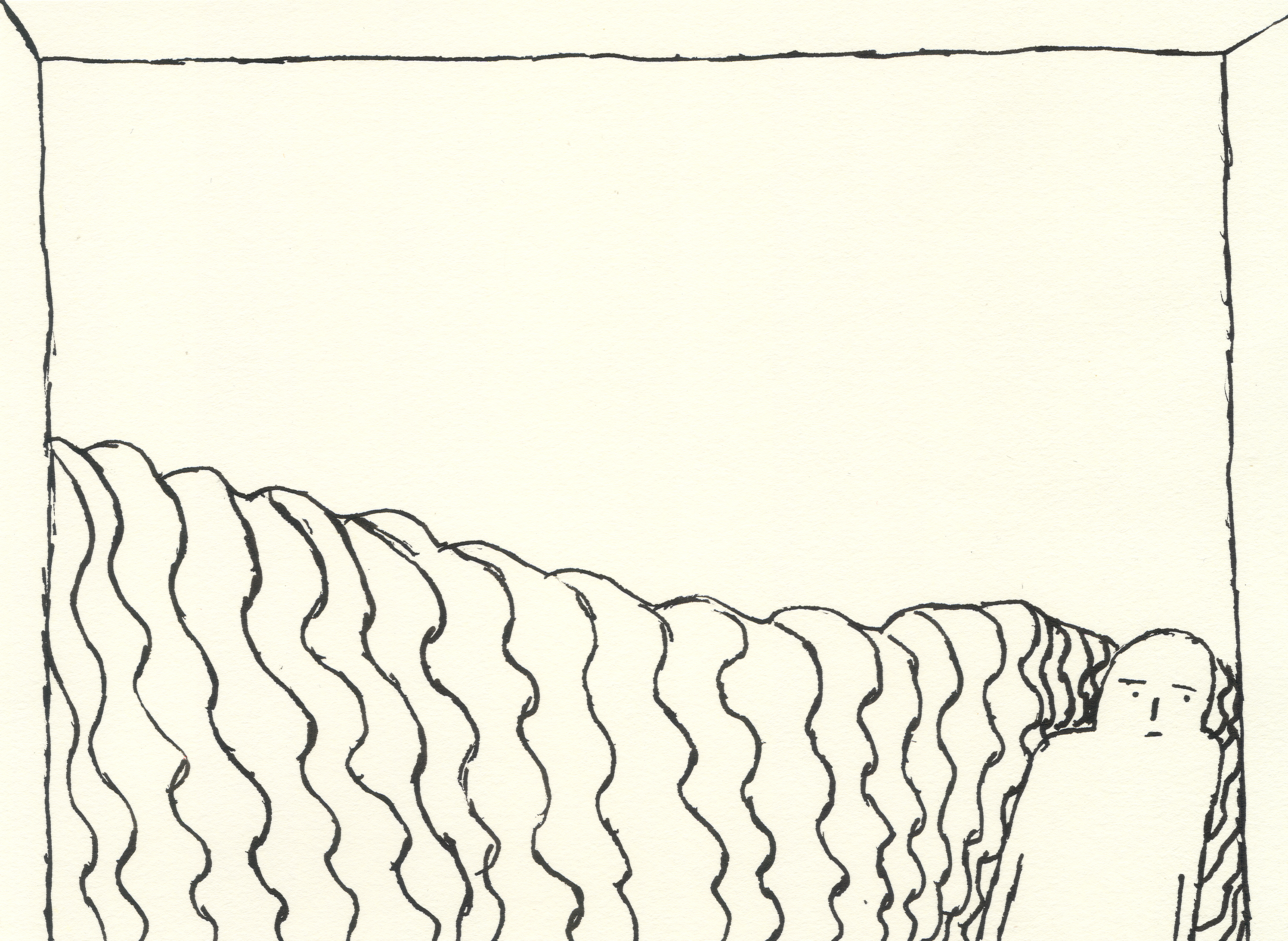 Desenho 4: Desenho feito com linhas pretas, apenas a metade inferior do papel está preenchida. Em primeiro plano na lateral direita inferior há a figura de um homem. Os traços são simples, onde só é possível identificar o rosto e o tronco até altura da cintura, os braços estão esticados na lateral do corpo. Envolta da figura há linhas sinuosas se desencadeando, são linhas que acompanham a extensão do seu corpo, uma atrás da outra – que lembram uma “trama montanhosa ou uma sucessão de ondas”.