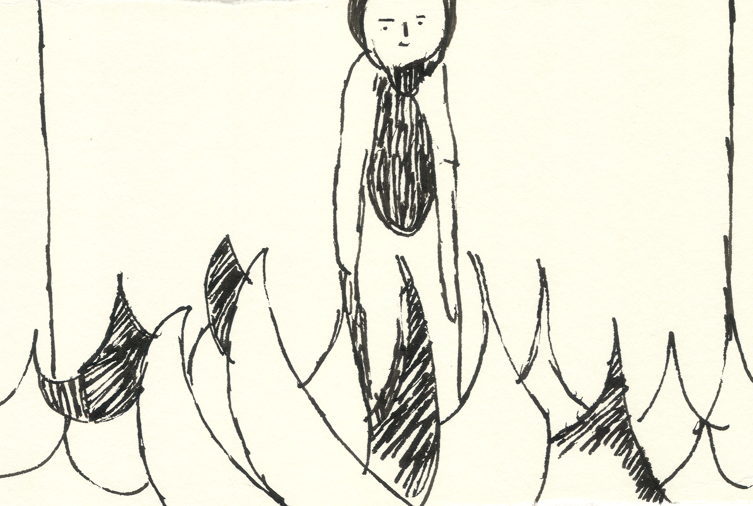Desenho 1: Desenho feito com linhas pretas em um suporte horizontal retangular. Centralizado no papel há uma figura humana com os braços ao lado do corpo e com a barriga riscada de preto. A cabeça da personagem é cortada pela extremidade superior do suporte. Suas pernas se perdem em formas pontiagudas que apontam para cima, lembrando ondas.