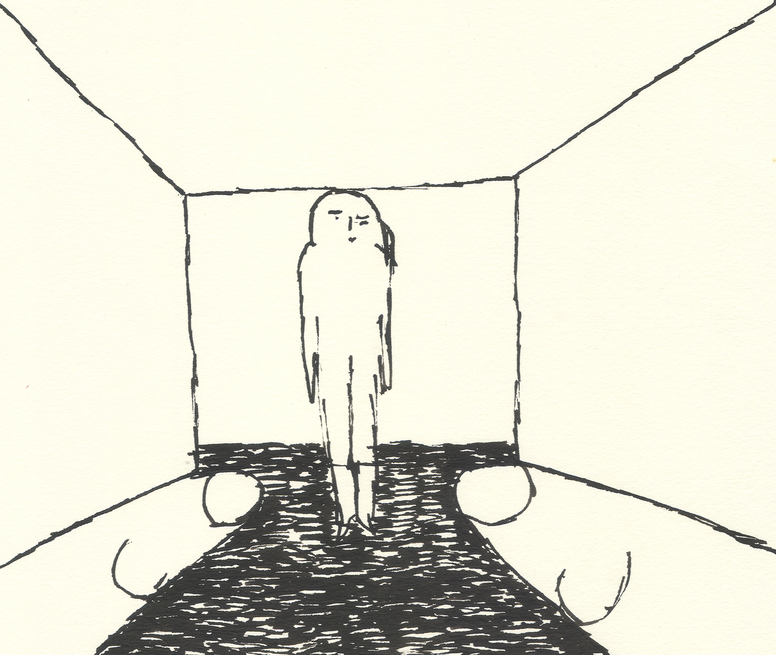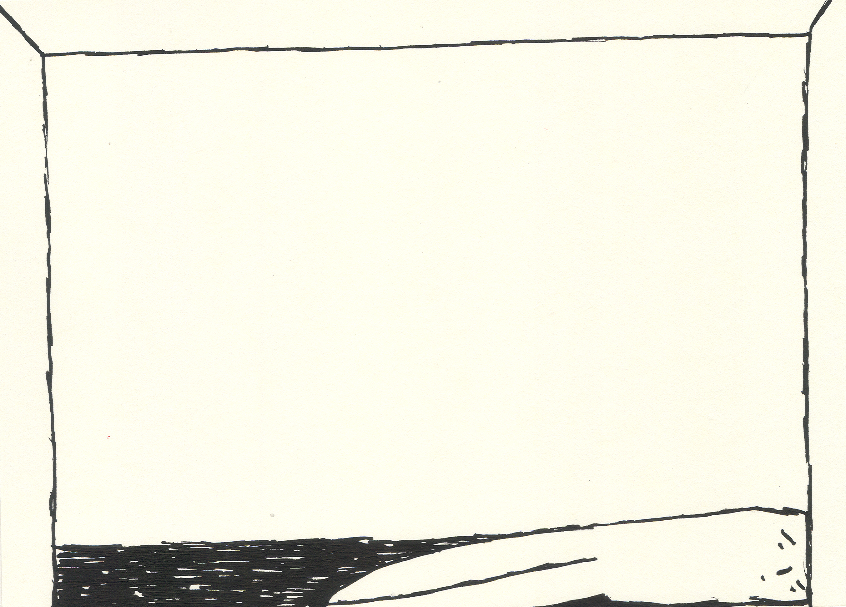 Desenho 3: Linhas retas em diagonal se ligam a um quadrado no fundo, indicando a perspectiva de uma sala onde uma figura humana está situada no centro da composição. Duas formas cilíndricas – que fazem lembrar dedos – acompanham as laterais inferiores, desde os cantos do suporte, em direção ao personagem. Em seu interior há semicírculos. O espaço, que corresponde ao plano horizontal (chão), está preenchido com riscos pretos.