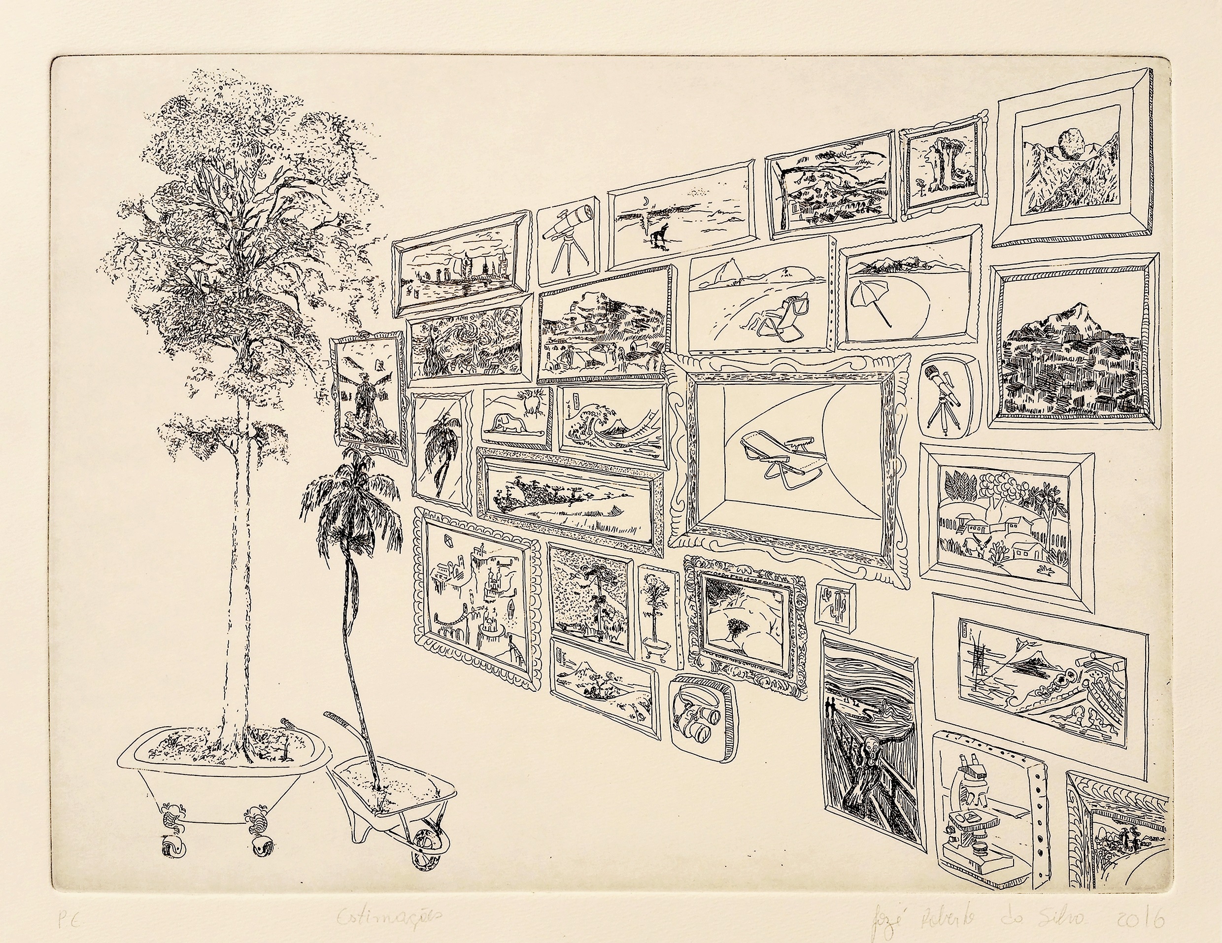 Os quadros, que representam desde pinturas famosas da história da arte – como “O Grito”, “A Origem do Mundo” e “Noite Estrelada” – até figuras de microscópios e binóculos e cenários de praia, compõem uma obra repleta de referências visuais. O artista nos explica: “Estimações partiu do conceito de ‘valor’ ou uma estimativa. Formada por um rearranjo de coisas/imagens, abordando alguns ícones da história das Artes Visuais, ou procedimentos como a perspectiva, ou a ‘janela’ de realidade para a imitação”. Com cara de sala de estar, a obra é uma espécie de vitrine e nos convida à observação atenta, para tentar descobrir os ícones e valores que o artista escolheu para sua composição.