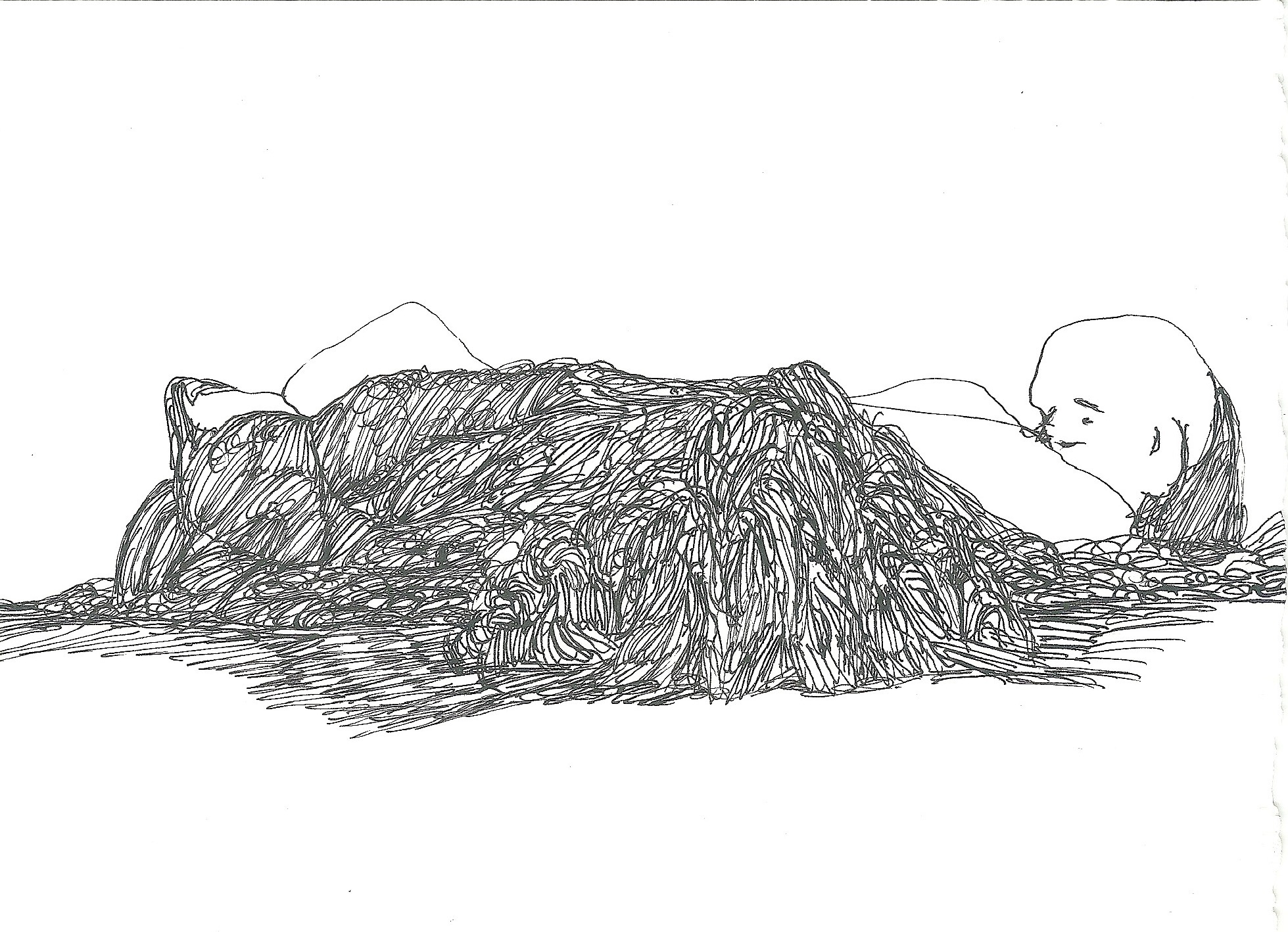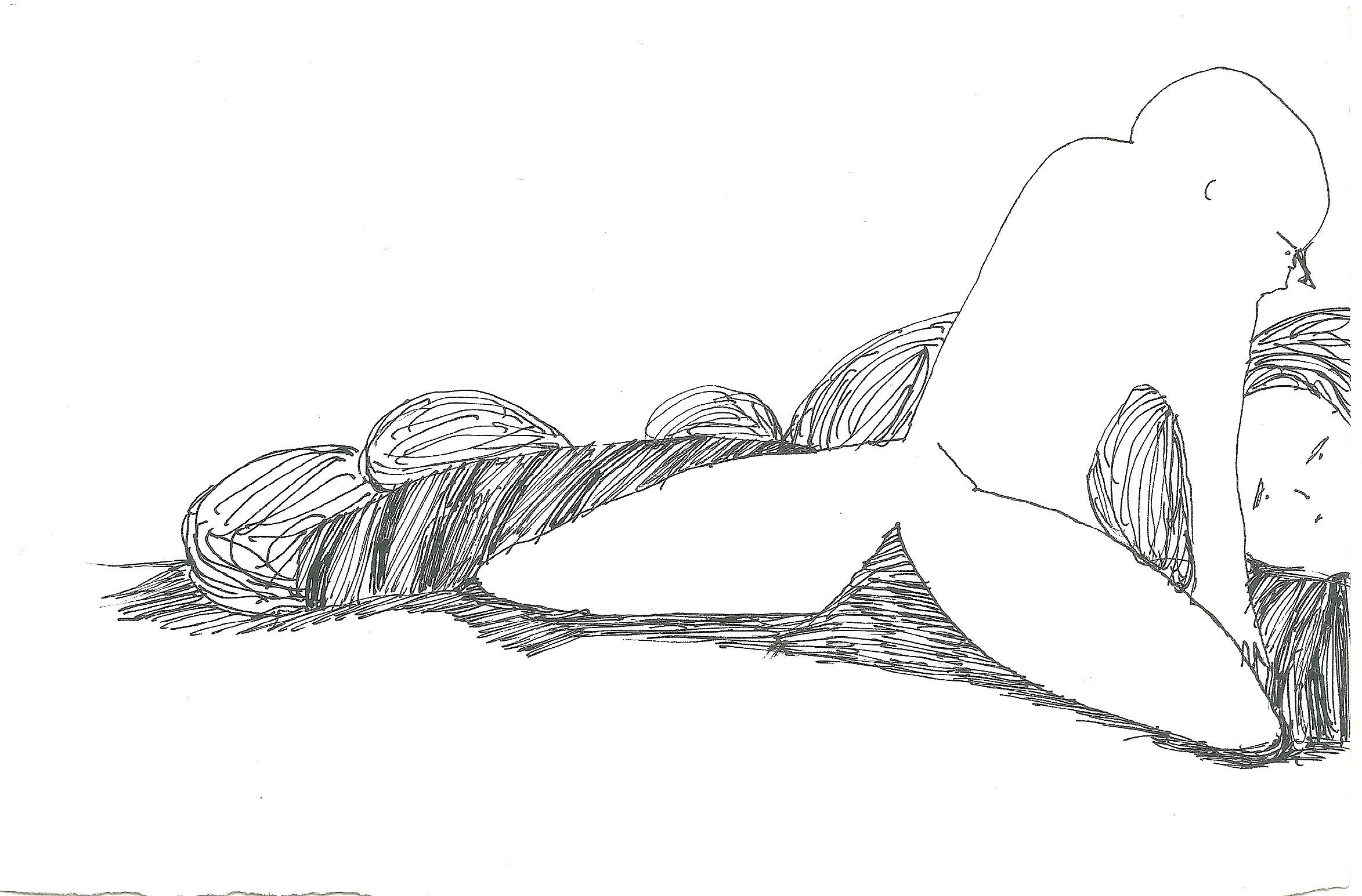 Uma imagem simples de um homem deitado no chão, uma paisagem.